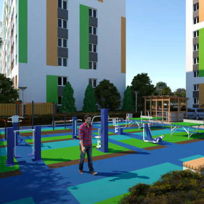 Большая парковка и двор без машин, как это возможно? Всё дело в правильном зонировании. Часть двора закрыта от машин. Вы сможете попасть на детские и спортивные площадки не выходя на парковку и проезжую часть. - Двор-парк - Ландшафтный дизайн - Уникальные игровые и спортивные зоны - Оборудование Work-out и зоны спокойного отдыха