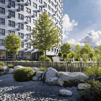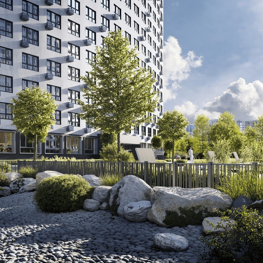 Силуэт динамичен: этажность плавно растёт от 16 до 20, а фасады — в светло-сером и ультрамарине с керамогранитом и лаконичными корзинами под кондиционеры. Всё, что нужно каждый день — в 5 минутах ходьбы: детский сад внутри комплекса, инновационная школа, аптеки, магазины и две автобусные остановки до метро. До «Девяткино» — 10 минут, до центра — 20–30. Выезд на КАД — всего 4 км. Для машин — отдельный трёхуровневый паркинг, для вещей — кладовые (сити-боксы) с прямым доступом на лифте. Здесь не просто живут — живут с удобством, которое чувствуется в каждой детали.