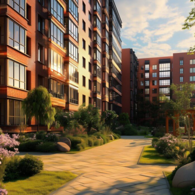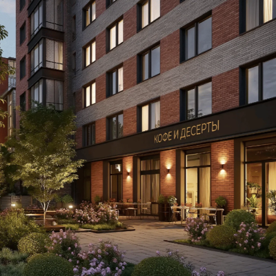 Внутренняя территория комплекса — это уютный двор без машин, с зелеными зонами для прогулок, кафе и магазинами на первых этажах. Здесь создаются идеальные условия для комфортного проживания и отдыха в любое время года.
