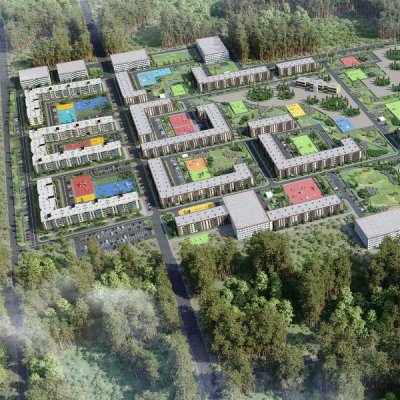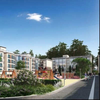 Придомовая территория будет благоустроена велодорожками, многочисленными зонами для отдыха, а также детскими игровыми площадками. В состав комплекса включено строительство школы, детского сада.