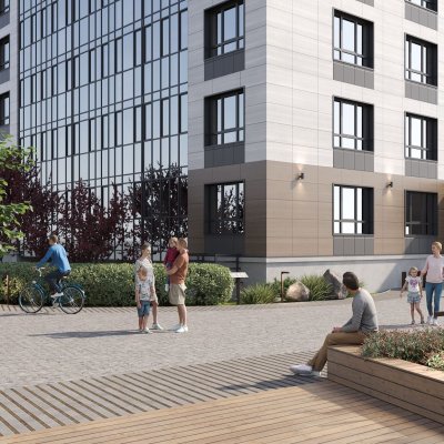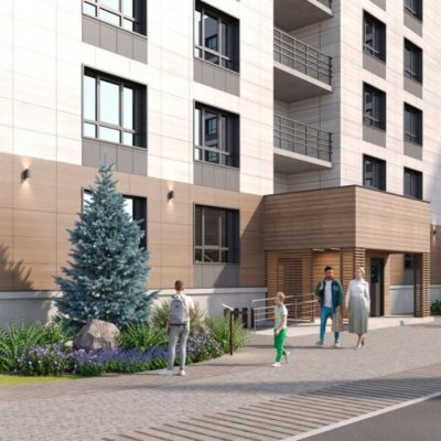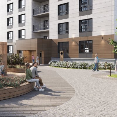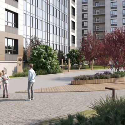 Благоустройство прилегающей территории предусматривает монтаж детской и спортивной площадок, парковочные места и озеленение.