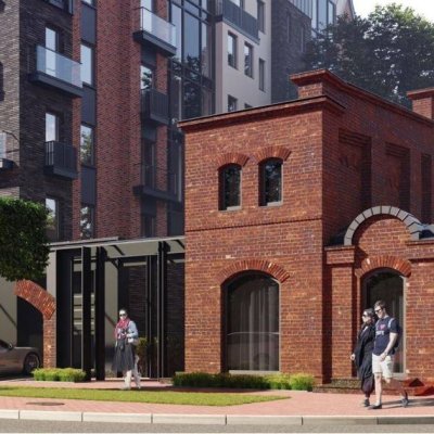 Фасады жилого комплекса украшены фронтонами, облицовка состоит из композитных материалов, натурального камня и клинкерного кирпича.