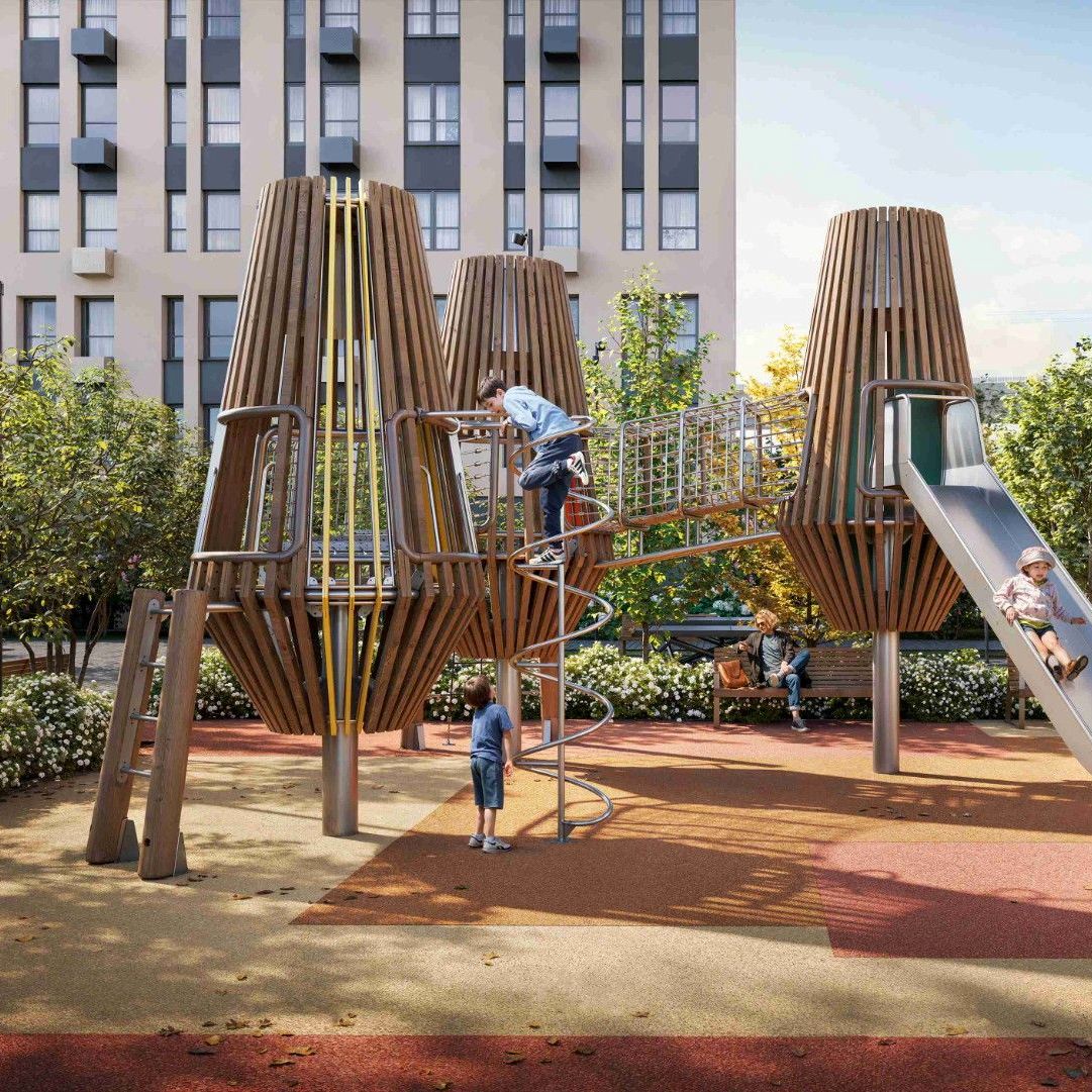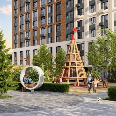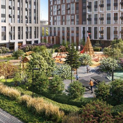 На территории: детские площадки с песочницами и лабиринтами, вынесенный плейхаб для старших детей, спортивные зоны с шахматами и теннисом, лаунж-зоны, тренажёры и скалодромы для подростков. Растения — по уровням: у воды — влаголюбивые, на маршрутах — крупномеры, в зонах отдыха — многолетние.
