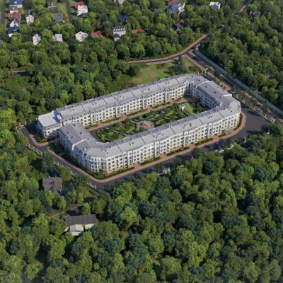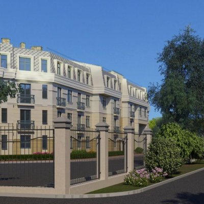 Дом, построенный в стиле неоклассицизма, в форме буквы С, образует уютное, полузамкнутое пространство. Застройщик разместил здесь гостевые парковки, небольшой обустроенный парк, произведения ландшафтных дизайнеров, игровой городок, физкультурную и хозяйственную площадки, газоны и цветники.