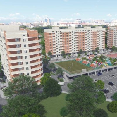Рядом с комплексом расположен уютный зеленый сквер, где можно в жаркий день прогуляться в тени деревьев. Прямо рядом с парком обустроены детские площадки и летние уютные кафе.