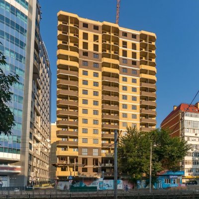 ЖК «Лидер» – это 17-этажная монолитно-каркасная башня с земельным участком 0,3 га и подземным паркингом на 31 машиноместо. Сейсмостойкость здания – 7 баллов. Фасады облицованы кирпичом бежевых и коричнево-шоколадных оттенков. Монолитные наружные стены дополнительно утеплены минераловатными плитами, кровля – полистиролбетоном. В доме 120 квартир: 90 однокомнатных 44-47 кв. м и 30 двухкомнатных 79-83 кв. м (с учетом понижающего коэффициента лоджий). Площадь кухни – 13-18 кв. м. Высота потолков «в чистоте» в подвале – 3,68 м, на первом этаже – 3 м, на типовых этажах с квартирами – 2,8 м. Квартиры расположены со 2-го по 16-й этаж. На техническом 17-м находится восемь кладовых площадью от 45 до 82 кв. м (с окнами, лоджиями и балконами), на первом – два офисных блока 230 и 238 кв. м с отдельными входами, помещение для консьержа и кладовая. Полы в общих зонах отделаны керамогранитной плиткой, стены покрашены. Квартиры сдаются с черновой отделкой: песчаная стяжка на полу, подготовленные стены, однокамерные стеклопакеты в пластиковых окнах, металлическая входная дверь российского производства, застекленные лоджии, стояки с холодной и горячей водой (с приборами учета, но без разводки) и трубами канализации. По квартире разведена электрика (без выключателей и розеток), установлен щиток. Выполнена горизонтальная разводка труб отопления и установка радиаторов. Дом оборудован пассажирским и грузопассажирским лифтом. Мусоропровода нет. Во дворе сделаны площадки для игр и спорта, парковочные места, проезды и тротуары, установлены системы видеонаблюдения, посажены деревья, газоны, кустарники. Для маломобильных групп населения предусмотрены пандусы.