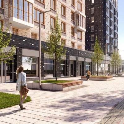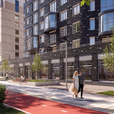 Первая очередь — это квартал из трех домов. В отделке фасадов используется силикатный кирпич и керамогранитные плиты в разных оттенках серого, с желтыми вставками и этническими узорами, предусмотрены декоративные блоки под кондиционеры.