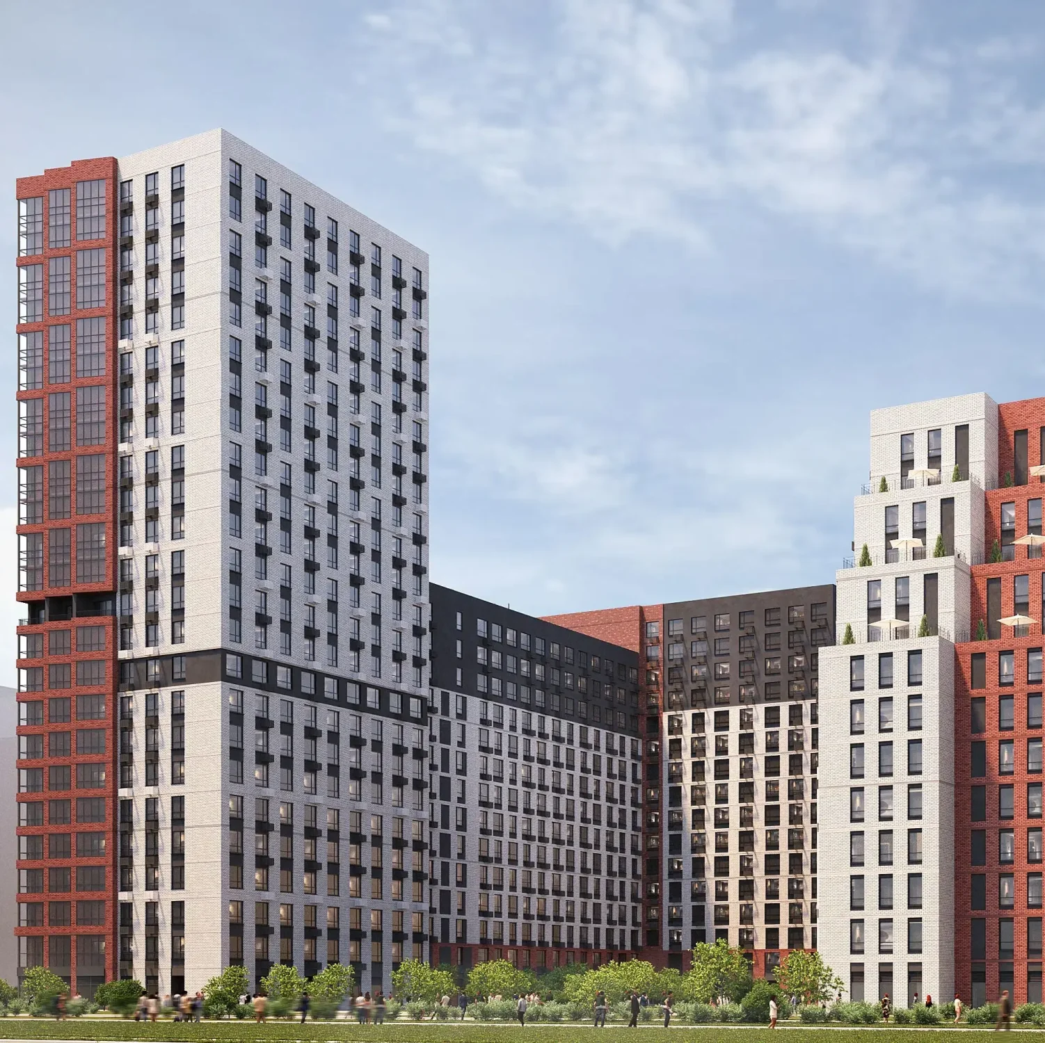 В проекте 28 домов высотой от 8 до 25 этажей, многоуровневый паркинг, детский сад, школа, закрытые дворы и большой пешеходный бульвар вдоль набережной.