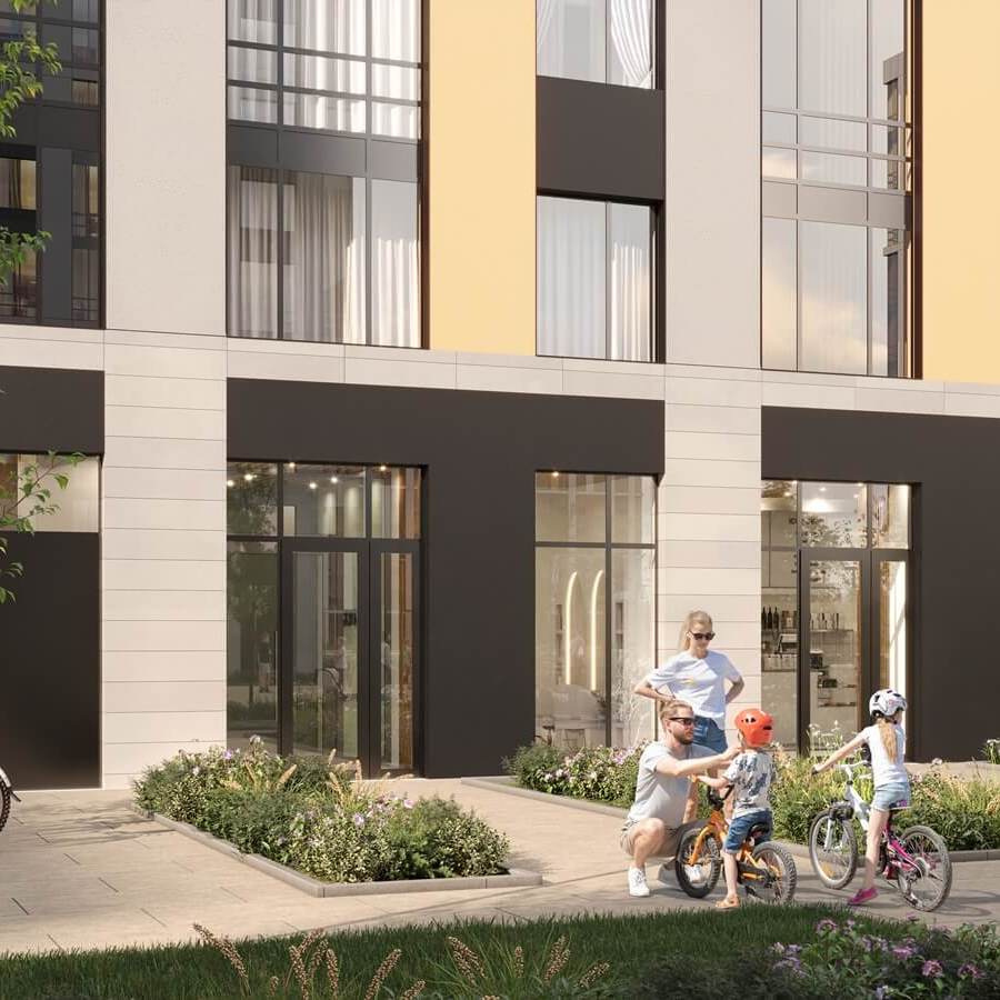 В домах Полис Новоселье просторные входные группы, наполненные естественным светом. Безбарьерная среда и вход в парадную с уровня земли облегчают жизнь мамам с маленькими детьми, которые могут свободно передвигаться по всей территории и оставлять детский транспорт в колясочной. В каждой парадной предусмотрены два выхода: во двор и на улицу. Это сократит ваше время на передвижения по территории комплекса и обеспечит безопасный выход для детей на игровую площадку