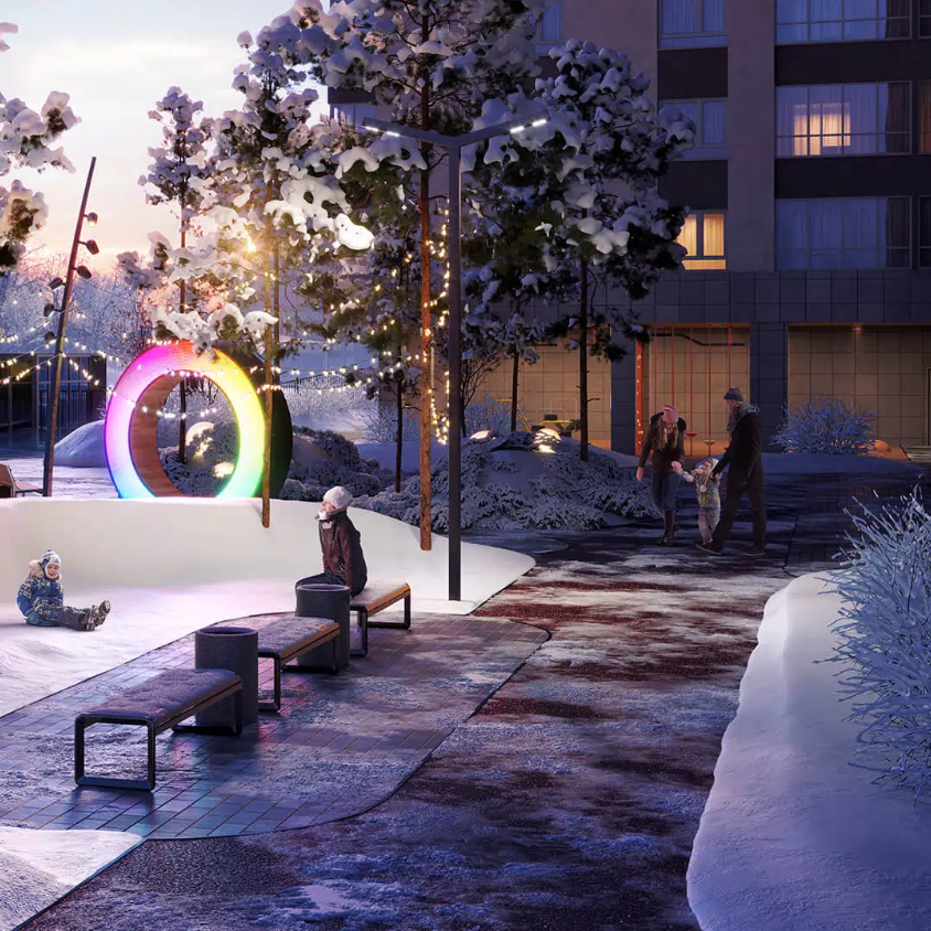 В ближайшей перспективе дом «ПРИТЯЖЕНИЕ» будет окружен такими значимыми инфраструктурными объектами как: новая школа на 1100 мест, высокотехнологичная поликлиника, современный торговый центр, новая транспортная развязка, обеспечивающая наличие остановки общественного транспорта прямо около дома. Придомовая территория это больше, чем просто двор – это центр притяжения для всех жителей дома. Это увлекательное приключение за границами квартиры: игровая зона с многоярусными лабиринтами для детей, уютная lounge-зона для взрослых, обособленная «своя» территория для подростков, – и все это доступно в любое время года, так как расположено под навесом.