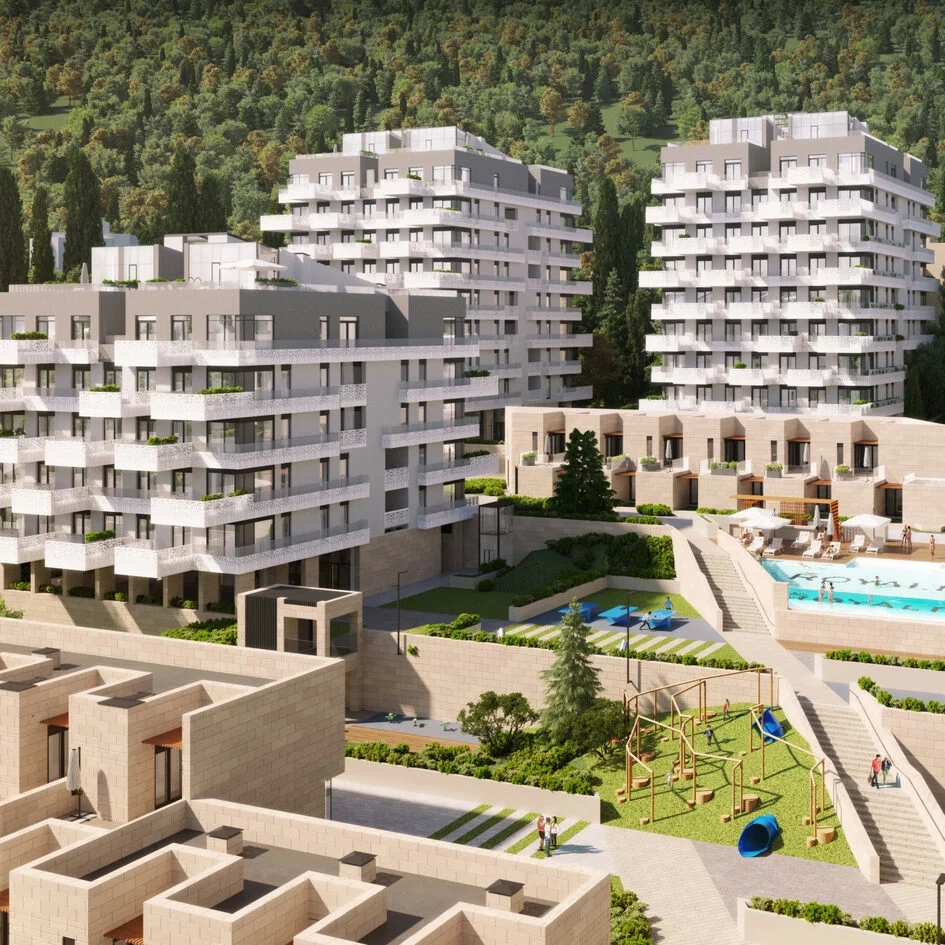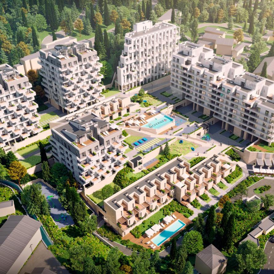ЖК «Роялта» представляет собой закрытый квартал, состоящий из нескольких клубных жилых корпусов с квартирами, а также секций с двухэтажными виллами с отдельным входом.