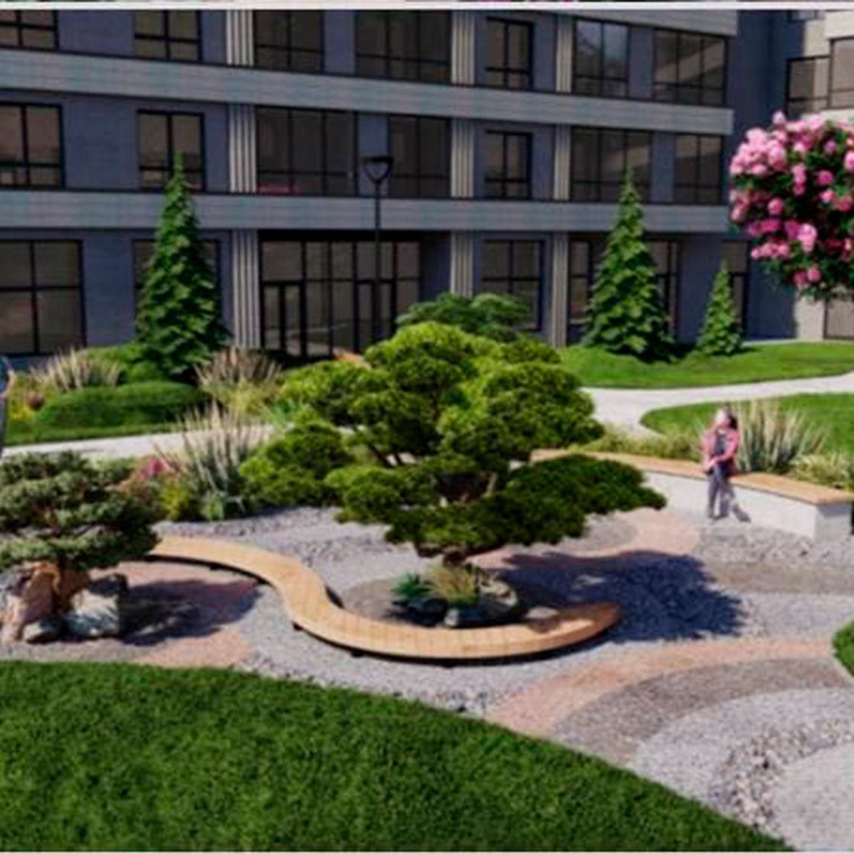 Территория жилого комплекса спроектирована и выполнена с основными элементами японского сада —вода, камни и растительность. Гармоничное сочетание символизма и минимализма. Цветущие деревья, сухие фонтаны, небольшие мостики. Место где можно насладиться близостью природы, при этом находясь практически в центре города.