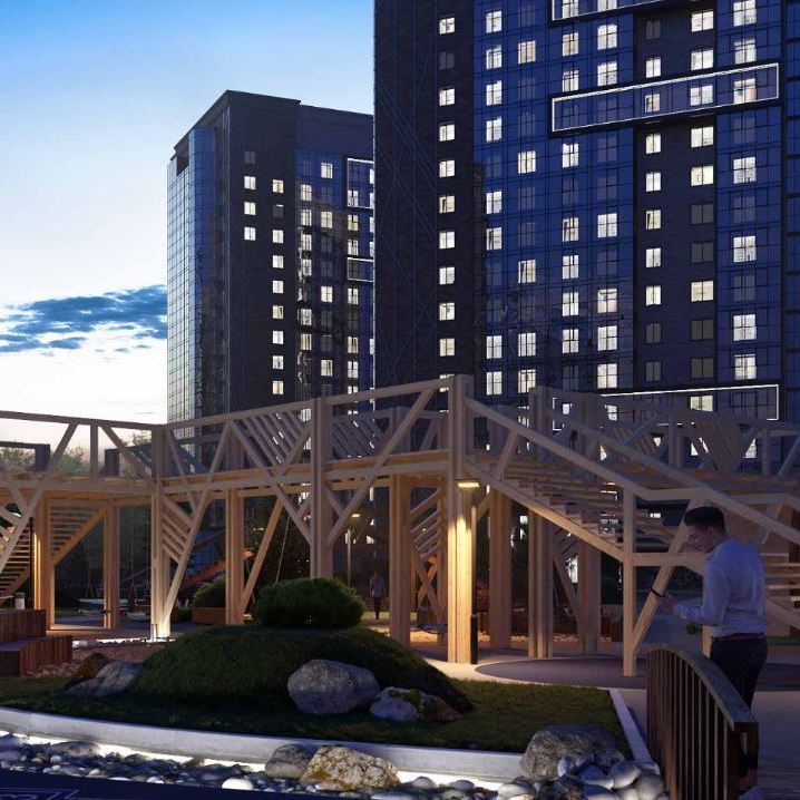 В проекте 9 домов высотой 17 этажей. Все они расположены таким образом, что большинство квартир имеет окна либо во двор, либо на территорию, уходящую вглубь участка, где расположены преимущественно малоэтажные строения. Окна самых просторных семейных квартир максимально повернуты внутрь участка, из них открываются лучшие виды на гладь озера. Кроме этого, такое решение имеет и утилитарный характер: можно присматривать за самостоятельно гуляющими во дворе детьми. Въезды в жилой комплекс организованы с трех сторон: с ул. Авиаторов, ул. Молокова и со стороны ЖК «Иннокентьевский».