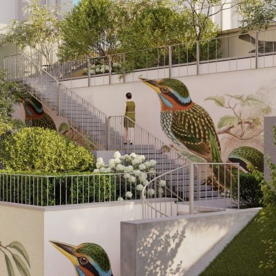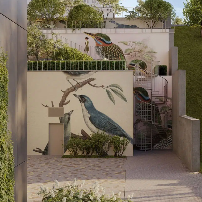 Зона «Малыш» продумана до мелочей с заботой о самых маленьких жителях. Она уютная, закрытая и безопасная, оснащена элементами для детей младшего возраста. Мурал с изображением птиц — специально оформленное место для фотографий, одно из самых фотогеничных в комплексе.