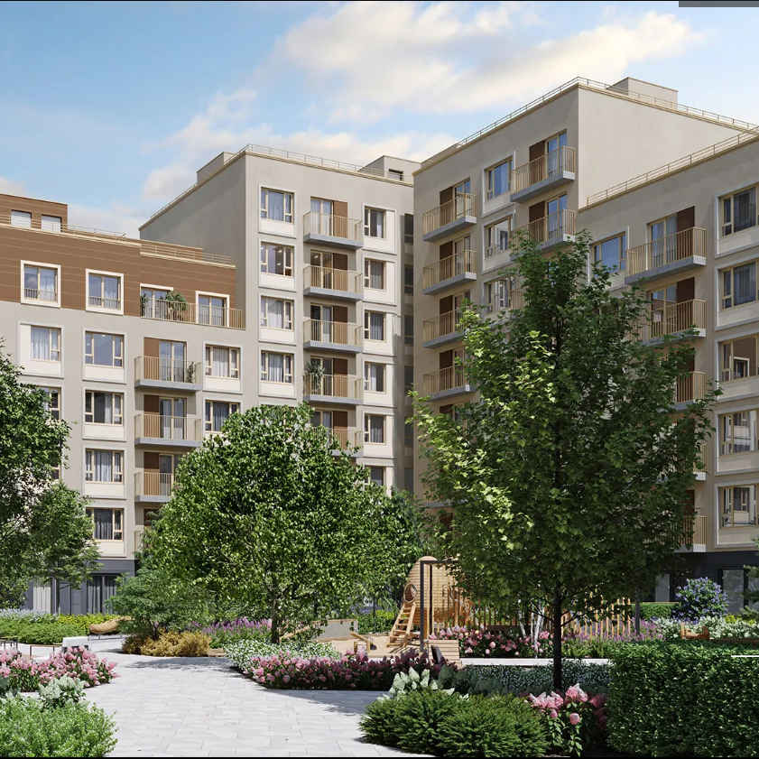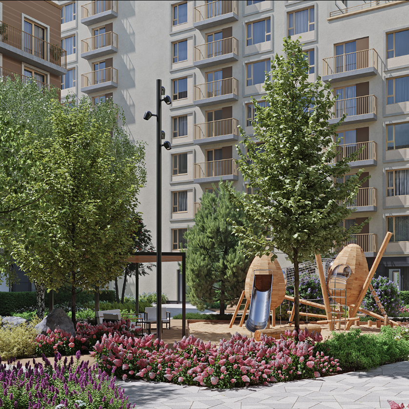 На въезде в квартал — прогулочный сквер с тенистыми тропинками: идеальное место для чтения, прогулок с собакой или утренней пробежки. Каждый двор — продолжение квартиры под открытым небом: гулять босиком по траве, заниматься йогой, читать в гамаке или отпускать детей играть — без тревоги за безопасность. Дворы закрыты от машин, с детскими площадками, перголами, мягкими газонами и зонами для общения с соседями.