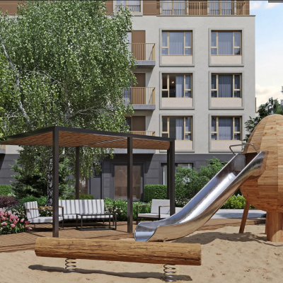 Для активного образа жизни — спортивная площадка с брусьями и уличными тренажёрами, столы для настольного тенниса, а также детская зона с батутами, тоннелями и абстрактными формами — для игр и развития воображения.