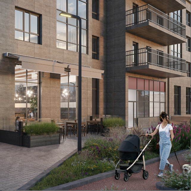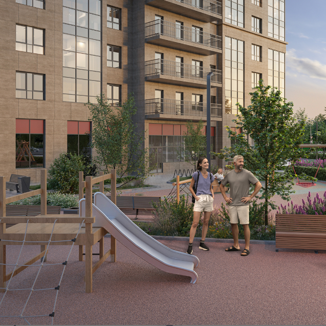 Здания возведены по монолитно-кирпичной технологии — сочетание скорости строительства и надёжности конструкций. Закрытый двор — живое пространство: взрослые деревья, тернистые аллеи, разнообразные растения и кустарники создают уютную, меняющуюся с сезонами атмосферу. Летом — цветущие клумбы, зимой — хвойный аромат голубых елей. Детская площадка спроектирована по мировым стандартам: зоны разделены по возрастам. Для малышей — песочница под навесом, для старших — качели, балансиры, батуты, горки и площадки для игр в мяч.