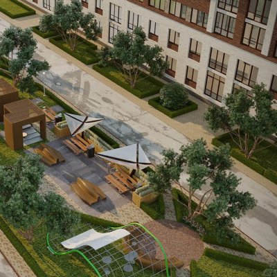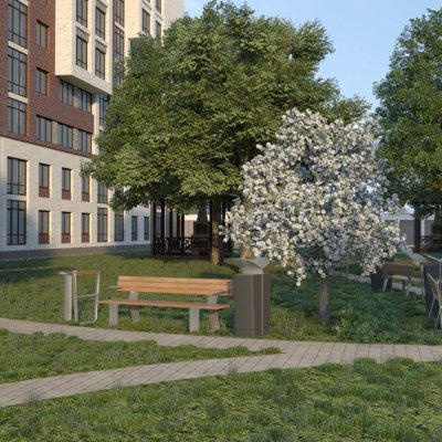 Внутреннее пространство двора будет представлять собой зелёную зону с размещенными на ней малыми архитектурными формами и прогулочными дорожками, лужайками и цветниками. Зонирование двора, ландшафтный дизайн, места отдыха с арт-объектами организованы с учетом возрастных групп. Между домами организована собственная парковая зона с беседками и лавочками, где у Вас будет возможность в тишине насладиться пением птиц.