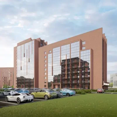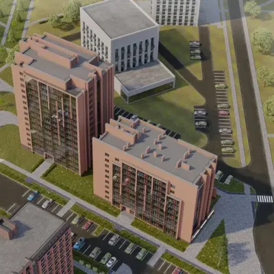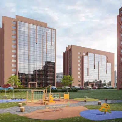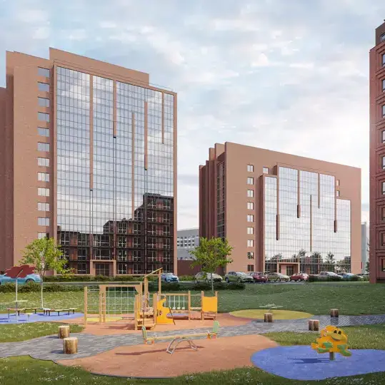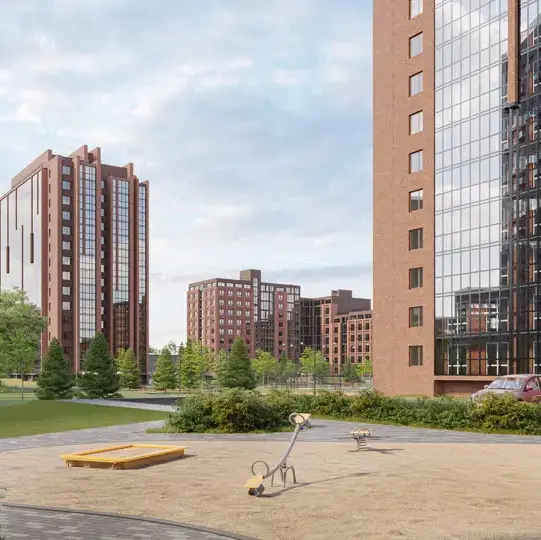 78 га зеленой территории с домами разной этажности из керамического кирпича, объединенные общественными пространствами с прогулочными аллеями и велосипедными дорожками, детскими и спортивными площадками.